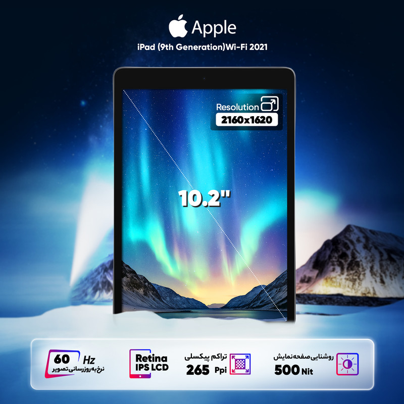بدون شک در میان تبلتهای موجود در بازار، آیپدهای اپل توانستهاند عملکرد بسیار خوبی را بهنمایش بگذارند. iPad (9th Generation) 10.2-Inch Wi-Fi (2021) هم بهعنوان یکی از جدیدترین محصولات اپل، مشخصات بسیار قدرتمندی را با خود بههمراه داشته است. در نمای روبهرویی این تبلت به صفحهنمایش 10.2 اینچ با رزولوشن 2160×1620 پیکسل مجهز شده است. صفحهنمایشی که توانایی نمایش 264 پیکسل در هر اینچ دارد. حداکثر روشنایی 500 نیت (شمع در متر مربع) هم سبب شده تا در شرایط نوری متنوع، وضوح تصویر بسیار خوب و باکیفیتی را از این صفحهنمایش شاهد باشید. برای دوربین سلفی این تبلت از سنسور 12 مگاپیکسلی استفاده شده است. سنسوری از نوع فوق عریض یا همان Ultra wideکه امکان ثبت تصاویر با زاویه دید گسترده 122 درجهای را در اختیارتان قرار میدهد. در قسمت پشتی هم یک سنسور دوربین اصلی با رزولوشن 8 مگاپیکسلی و گشودگی دریچه دیافراگم f/2.4 از نوع عریض در نظر گرفته شده است. اما اصلیترین مشخصه این محصول، بدون شک پردازنده در نظر گرفته شده است. Pad (9th Generation) 10.2-Inch Wi-Fi (2021) به پردازنده قدرتمند A13 بایونیک مجهز شده است. پردازندهای که توانایی ارائه عملکرد بسیار خوبی را در بازیهای سنگین و نرمافزارهای سنگین را دارد.