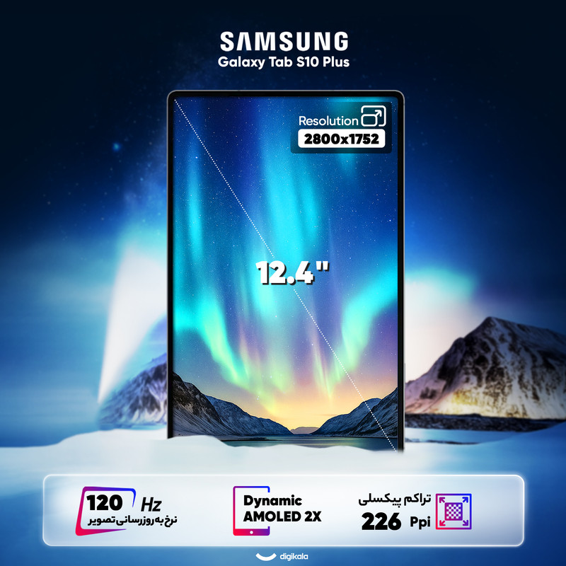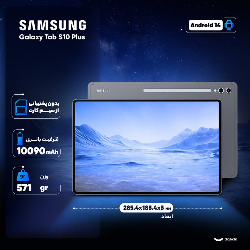 تبلت سامسونگ Galaxy Tab S10 Plus Wi‑Fi با نمایشگر ۱۲.۴ اینچی و طراحی ظریف، محصولی پیشرفته و مناسب برای کاربران حرفه‌ای و علاقه‌مندان به تجربه چندرسانه‌ای باکیفیت است. این دستگاه که در ۲۶ سپتامبر ۲۰۲۴ معرفی شد، بدنه‌ای فلزی با فریم و پشت آلومینیومی، و جلویی شیشه‌ای دارد که علاوه بر استحکام، حس لوکس و مدرن را القا می‌کند. ابعاد ۲۸۵.۴×۱۸۵.۴×۵ میلی‌متر و وزن ۵۷۱ گرم آن، حمل و استفاده روزمره را آسان می‌سازد.