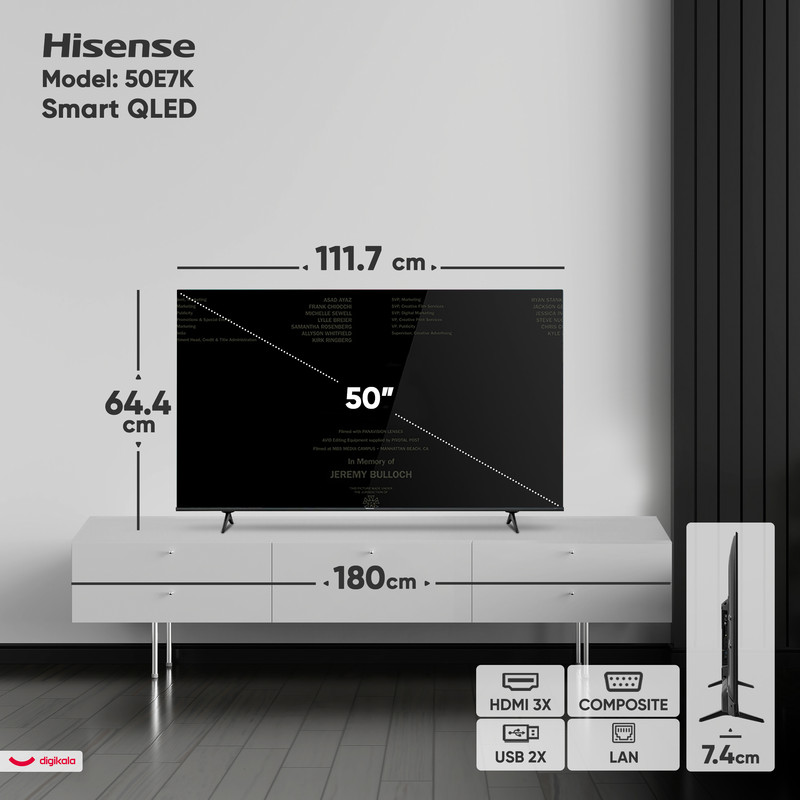 تلویزیون 50 اینچ کیو ال ای دی هوشمند هایسنس مدل 50E7K یکی از محصولات خوش ساخت برند هایسنس است که با طراحی مدرن، کیفیت تصویر چشمنواز و امکانات متنوع، توجه بسیاری از خریداران را به خود جلب کرده است. این تلویزیون با ابعاد متناسب و سبک طراحی تخت، بهراحتی با دکوراسیونهای مختلف هماهنگ میشود و جلوه زیادی دارد. یکی از مهمترین ویژگیهای تلویزیون 50E7K، کیفیت تصویر 4K با رزولوشن 2160 × 3840 پیکسل است که تصاویری شفاف، با جزئیات بالا و رنگهای زنده به نمایش میگذارد. هایسنس در این مدل از تکنولوژی QLED بهره گرفته است که به لطف فناوری Quantum Dot، رنگها را با دقت بیشتر و درخشش بالاتری به تصویر میکشد. این ویژگی باعث میشود هنگام تماشای فیلمها، سریالها و بازیهای ویدیویی، تجربهای کاملاً غوطهورکننده و چشمنواز داشته باشید. عمق رنگ 8 بیتی در کنار پشتیبانی از فرمتهای HDR10، Dolby Vision، +HDR10 و HLG باعث شده است تلویزیون 50E7K در نمایش محتوای HDR عملکرد قابل قبولی داشته باشد. هرچند نرخ بهروزرسانی 60 هرتزی آن ممکن است برای گیمرهای حرفهای کمی محدود باشد، اما برای استفادههای روزمره و تماشای برنامهها، فیلمها و مسابقات کاملاً مناسب است و تصاویر روان و با کیفیتی را ارائه میدهد. در بخش صدا، هایسنس برای این تلویزیون از سیستم صوتی با توان خروجی کلی 16 وات استفاده کرده است. این میزان توان ممکن است برای فضاهای بسیار بزرگ کافی نباشد، اما در اتاقهای متوسط و کوچک، صدای فراگیر و شفافی را به خوبی پخش میکند. به علاوه، بهرهگیری از تکنولوژیهای صوتی پیشرفته مانند Dolby Atmos و DTS صدا را با جزئیات و وضوح بالا به گوش میرساند و حس حضور در صحنه را به کاربر منتقل میکند. تلویزیون 50E7K از نظر درگاههای ارتباطی هم کامل و کاربردی طراحی شده است. با وجود 3 پورت HDMI دو پورت USB، ورودی آنتن، جک 3.5 میلیمتری صدا، درگاه LAN و ورودی کامپوزیت، به آسانی میتوانید دستگاههای مختلف مانند کنسول بازی، فلش مموری، ساندبار یا سیستم صوتی را به تلویزیون متصل کنید. همچنین این تلویزیون با مجهز بودن به بلوتوث و Wi-Fi امکان اتصال بیسیم به سایر گجتها و اینترنت را برای کاربران فراهم کرده است. هایسنس در طراحی این مدل به مصرف انرژی هم توجه داشته است و با گرید انرژی A و مصرف برق مناسب، تلویزیونی کممصرف و بهینه ارائه داده است. شکل پایههای دوشاخهای و امکان نصب روی دیوار به شما این آزادی را میدهد که مطابق با نیاز خود تلویزیون را روی میز یا دیوار قرار دهید.