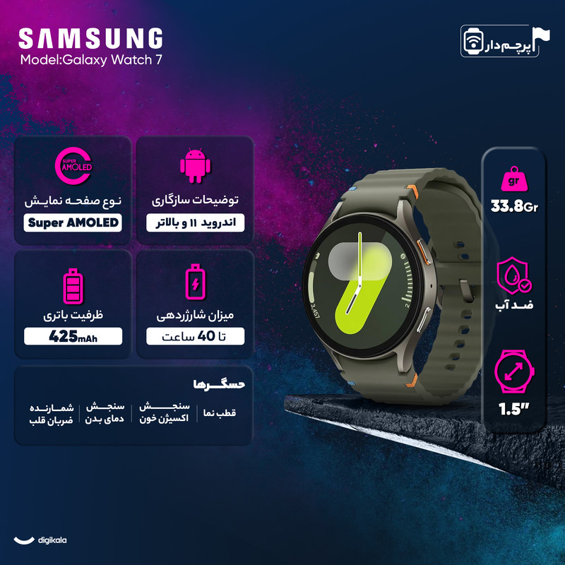 Galaxy Watch 7 مجهز به حسگرهای متعددی مانند سنجش ضربان قلب، اکسیژن خون، فشارسنج، قطبنما، ارتفاعسنج و ژیروسکوپ است که به شما کمک میکند تا سلامت خود را به طور دقیق رصد کنید. همچنین، این ساعت از GPS برای مکانیابی دقیق و پایش وضعیت خواب و سلامت بانوان پشتیبانی میکند. باتری ۴۲۵ میلیآمپر ساعتی آن باقابلیت شارژ بیسیم، عمر طولانی را در اختیار شما قرار میدهد. با گواهی IP68 و مقاومت در برابر آب تا عمق ۵۰ متر، این ساعت برای استفاده در شرایط مختلف، ازجمله ورزشهای آبی، مناسب است.