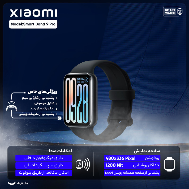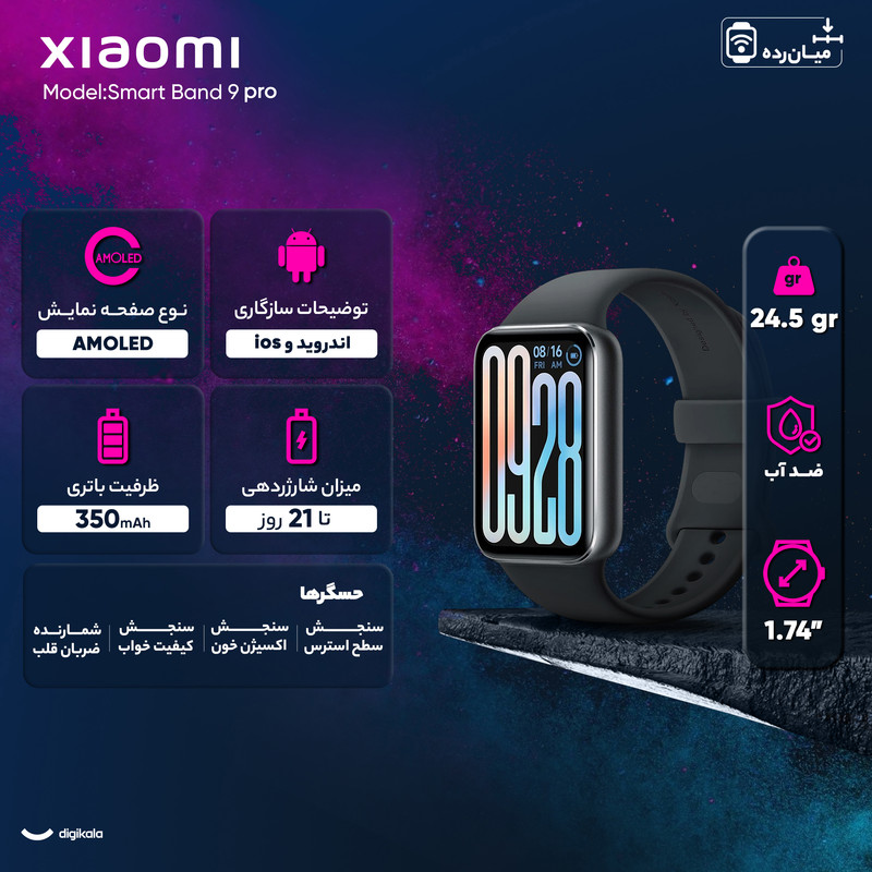 ساعت هوشمند شیائومی مدل Smart Band 9 Pro یکی از جدیدترین محصولات این برند است که با طراحی ظریف، امکانات پیشرفته و عملکرد بهینه، گزینه‌ای مناسب برای کاربری روزمره و ورزشی به‌ شمار می‌رود. این ساعت با وزن سبک 24.5 گرم و بدنه‌ای از جنس آلومینیوم همراه با بند TPU، به‌راحتی روی مچ دست قرار گرفته و برای استفاده طولانی ‌مدت، فوق‌العاده عمل می‌کند. صفحه نمایش 1.74 اینچی AMOLED با رزولوشن 336×480 پیکسل و تراکم 336 پیکسل بر اینچ، تصاویری شفاف و پر جزئیات را به نمایش می‌گذارد. روشنایی 1200 نیت صفحه نمایش، باعث شده خوانایی اطلاعات نمایش داده شده روی صفحه نمایش، حتی زیر نور مستقیم خورشید، مختل نشود. با نرخ تازه‌سازی 60 هرتز، تجربه‌ای روان از کار با این ساعت هوشمند را به ارمغان می‌آورد. Smart Band 9 Pro به مجموعه‌ای از حسگرهای کاربردی مجهز شده است. قابلیت کنترل سطح اکسیژن خون (SPO2)، شمارش ضربان قلب و پایش وضعیت خواب، این ساعت را به یک همراه سلامت ایده‌آل تبدیل کرده‌ است. همچنین، برای ورزشکاران، 150 حالت ورزشی همراه با فناوری‌های مکان‌یابی پیشرفته GPS، GLONASS، Galileo و QZSS، ثبت دقیق مسیرها و فعالیت‌های ورزشی را فراهم می‌کند. باتری قدرتمند350 میلی‌آمپری Smart Band 9 Pro هم با یک‌بار شارژ می‌تواند در استفاده معمول تا 21 روز دوام بیاورد و تنها در 75 دقیقه به‌طور کامل شارژ می‌شود. علاوه ‌بر این، ضد آب بودن تا عمق 50 متر و اتصال بلوتوث نسخه 5.4، کارایی این ساعت را در فعالیت‌های روزمره و ورزشی تکمیل می‌کند. سازگاری با اندروید 8 و iOS 12 به بالا، امکان اتصال به طیف وسیعی از دستگاه‌های هوشمند را فراهم کرده است.