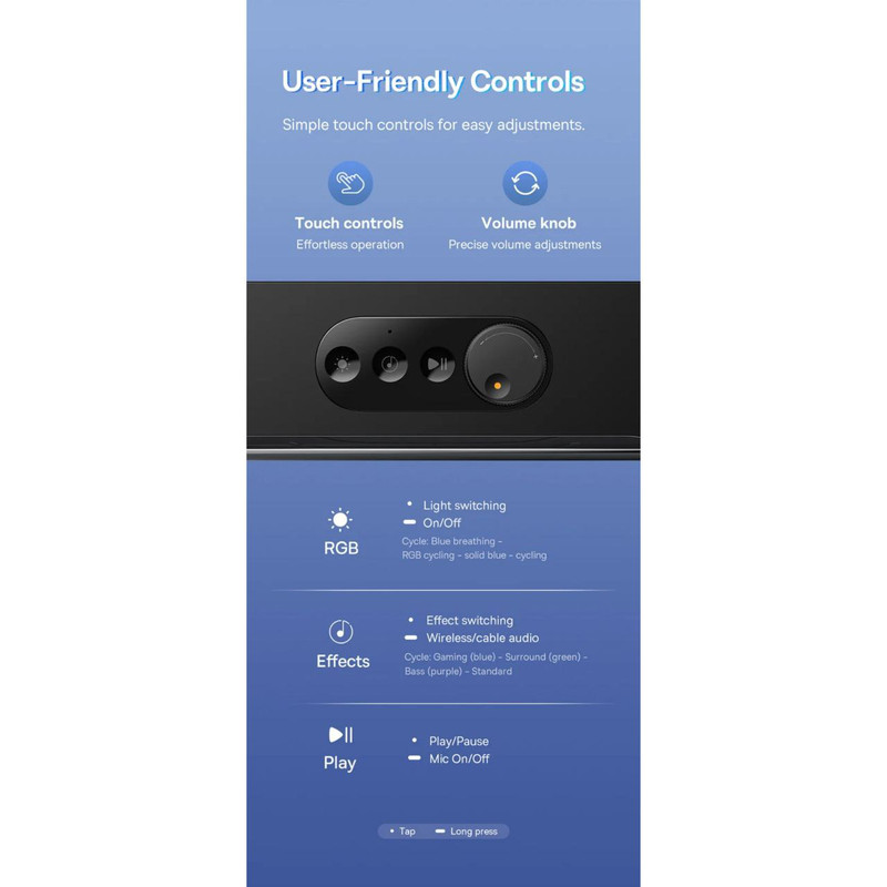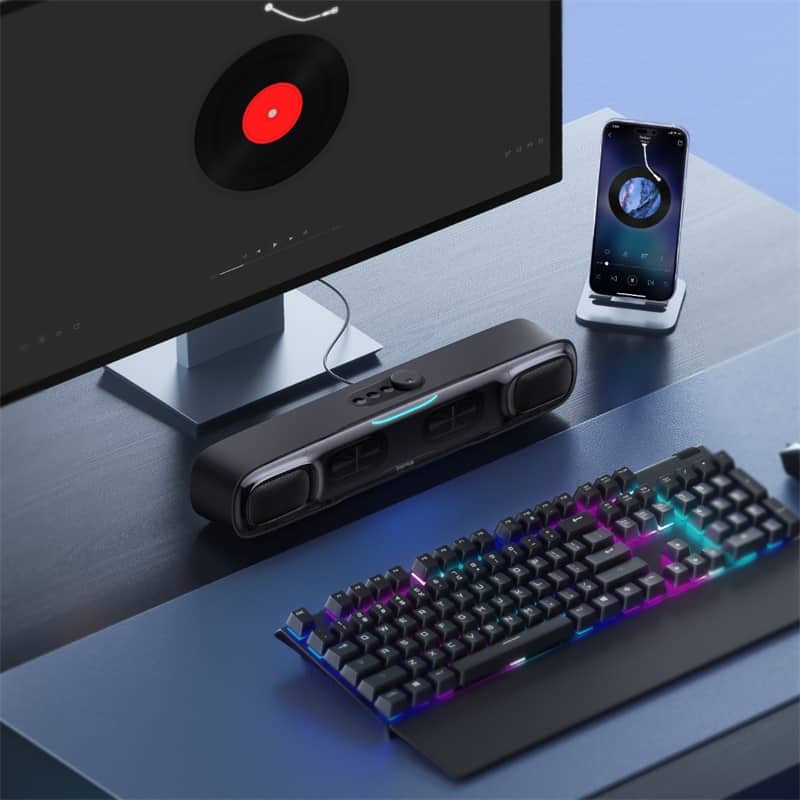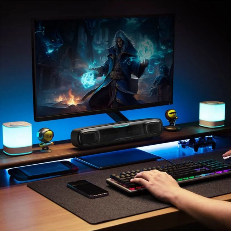 مینی ساندبار بیسوس نه تنها با کیفیت صدای عالی خود شما را تحت تأثیر قرار می دهد بلکه میز کار شما را نیز تزئین می کند. دارای طراحی مینیمالیستی و مدرن است که به راحتی می توان آن را در هر چیدمانی گنجاند. همچنین نسبتا جمع و جور است – فقط در حدود 375 × 76 × 60 میلی متر است. به راحتی می توانید آن را روی قفسه یا میز قرار دهید! مزیت اضافی دستگاه نورپردازی 7 رنگ RGB آن است. با استفاده از برنامه اختصاصی می توانید سبک آن را مطابق با ترجیحات خود سفارشی کنید.