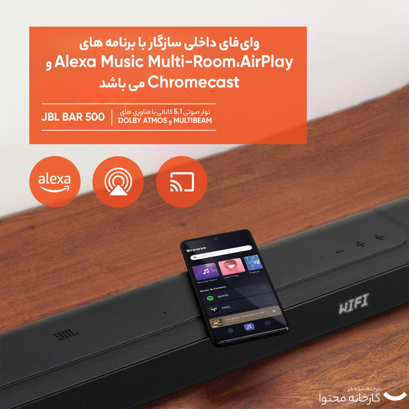 از تمام محتوای صوتی مورد علاقه خود، رادیو اینترنتی و پادکستها با کیفیت بالا لذت ببرید. اتصال Wi-Fi همچنین بهروزرسانی خودکار نرمافزار را امکانپذیر میکند، بنابراین همیشه میتوانید از آخرین ویژگیها لذت ببرید. به سادگی JBL Bar 500 را با دستگاه دارای دستیار صوتی خود پیوند دهید و میتوانید فوراً از Alexa، Google Assistant یا Siri بخواهید که تمام موسیقی مورد علاقه شما را در ساندبار پخش کند.