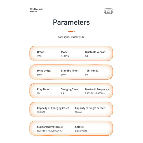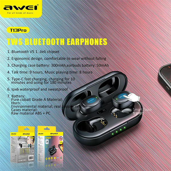 «هندزفری بلوتوثی اوی» مدل (T13Pro) محصول جدیدی از برند اوی است. این محصول از سری هدفونهای True Wireless است و دارای بلوتوث نسخه 5.1 میباشد، برد بلوتوث این هدفون تا 10 متر محاسبه شده است. که از طریق بلوتوث میتوانید هدفون را به گوشی هوشمندتان وصل کنید و از قابلیت پخش موسیقی و مکالمه آن بهرهمند شوید. این مدل هدفون بسیار سبک طراحی شده و این ویژگی باعث میشود تا در استفاده دراز مدت گوشتان را اذیت نکند.