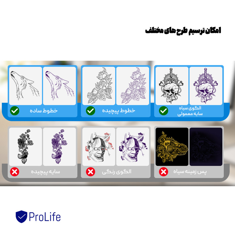 پرینتر استنسیل پرولایف PROLIFE ATS886 یک دستگاه پیشرفته و قابل حمل است که برای حرفهایهای تاتو طراحی شده است. این پرینتر با وزن سبک و ابعاد کوچک، به راحتی قابل حمل است و با رزولوشن چاپ 203 dpi، تصاویر با کیفیت بالا و جزئیات دقیق را ارائه میدهد. باتری لیتیوم-یونی 1200 میلیآمپر ساعتی آن میتواند تا 200 استنسیل کوچک یا 80 استنسیل بزرگ را با یک بار شارژ تولید کند. این دستگاه دارای دو گزینه اتصال USB-C و بلوتوث نسخه 5.0 است که انعطافپذیری بیشتری را برای کاربران فراهم میکند. پرینتر ATS886 با سیستمعاملهای مختلف از جمله اندروید، iOS، ویندوز، MacOS و ChromeOS سازگار است. نرمافزار "ATS886" به کاربران این امکان میدهد تا طرحهای خود را آپلود کرده و اندازه تصویر، عمق خطوط و موقعیت تصویر را تنظیم کنند. این پرینتر با ویژگیهای منحصر به فرد خود، فرآیند انتقال طرحهای تاتو را سریعتر و دقیقتر میکند و به هنرمندان تاتو اجازه میدهد تا زمان بیشتری را به اجرای تاتو اختصاص دهند. این دستگاه با ارائه کیفیت بالا، قابلیت حمل و نقل آسان و انعطافپذیری در اتصال، یک ابزار ضروری برای هر هنرمند تاتو حرفهای است. این پرینتر به سفارش شرکت پرولایف تولید شده است و شامل شرایط وخدمات ویژه این شرکت میباشد