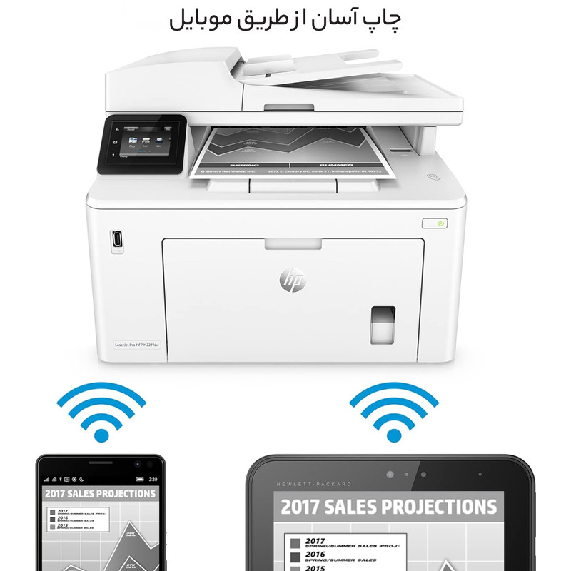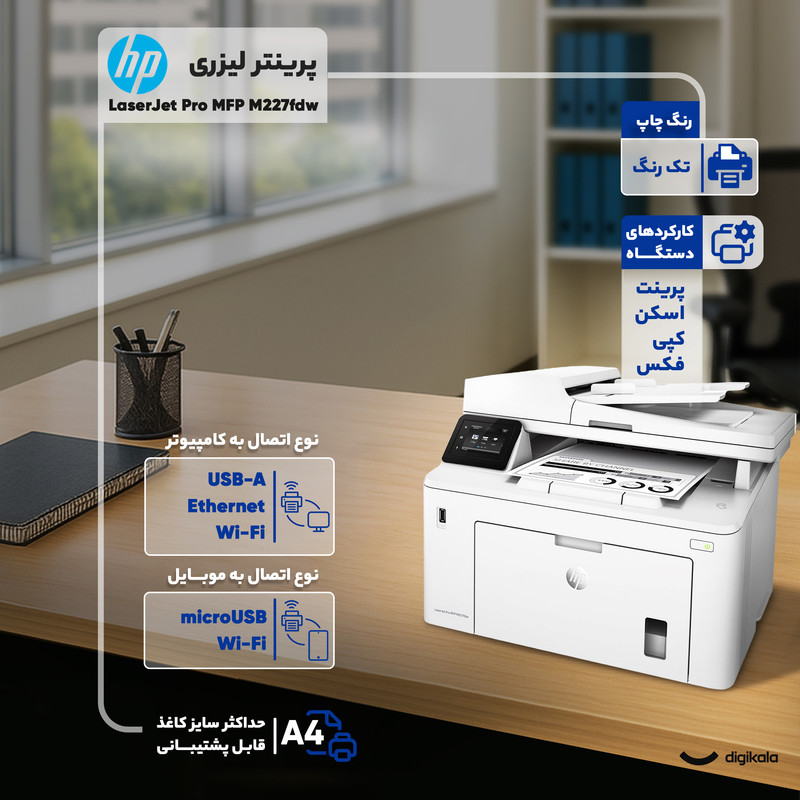 پرینتر چندکارهی شرکت «اچپی» (HP) مدل «LaserJet Pro MFP M227fdw» با فناوری چاپ لیزری و تکرنگ، برای مصارف اداری مناسب است. این دستگاه قابلیت پرینت، اسکن، کپی و فکس دارد. پرینترهای لیزری برای چاپ اسناد مناسب هستند و در کنار کیفیت عالی چاپ متون، سرعت خوبی هم دارند. سینی کاغذ این پرینتر تا 250 برگ ظرفیت دارد و میتواند تا 30 برگ در دقیقه پرینت بگیرد. این پرینتر چندکاره به تغذیه خودکار ADF نیز مجهز شده است و 35 برگ ظرفیت دارد. در این پرینتر، امکان چاپ دو رو وجود دارد. یکی از نکات مثبت آن اتصال وای-فای است. بهوسیله وای-فای دایرکت طیف وسیعی از دستگاهها قادر به اتصال و پرینت در کمترین زمان ممکن خواهند بود. این پرینتر چندکاره دارای فناوری خاموش شدن خودکار برای صرفهجویی در انرژی است، یعنی هنگامیکه شما در حال کارکردن با دستگاه نیستید، این پرینتر بهطور خودکار خاموش و هنگام پرینت گرفتن و یا ارسال فایلی از تلفن هوشمند روشن میشود و شروع به کار میکند. در سمت چپ این دستگاه یک صفحهنمایش LCD لمسی 6.9 سانتیمتری تعبیه شده است. ناگفته نماند، پرینت مستقیم با وصل کردن حافظه فلش نیز امکان پذیر است. درمجموع این پرینتر یک مجموعهی کارآمد است که برای مصارف مختلف اداری می توان روی آن حساب کرد.