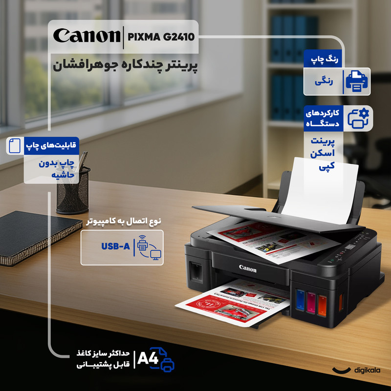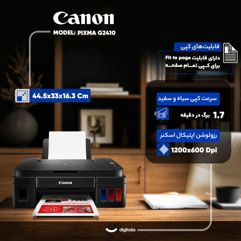 پرینتر«کانن» (Canon) مدل «PIXMA G2410»باقابلیت چاپ رنگی برای مصارف خانگی و اداری گزینهی مناسبی به شمار میرود. این دستگاه، علاوه بر پرینت، از قابلیتهای اسکن و کپی نیز بهره میبرد. اگر محل کار کوچکی دارید، این پرینتر با ابعاد جمعوجور، فضای کوچکی از میز کارتان را اشغال خواهد کرد و با وزن 6.32 کیلوگرمی بهراحتی قابل جابهجایی است. با مجهز شدن به سیستم مخزن جوهر، پرینتر PIXMA G2410 هزینهها را بسیار کاهش داده است؛ در این سیستم کافی است، کاربر جوهر را در مخزن موردنظر و همرنگ بریزد و به امور چاپی بپردازد. پرینترهای پیکسما برای چاپ تصاویر گزینهی بسیار ایدئالی هستند. این پرینتر به رزولوشن چاپ 1200 × 4800 dpi مجهز شده است و تصاویر رنگی و متون سیاهوسفید را با کیفیت بالایی به چاپ میرساند. از دلایلی که باعث شده تا پرینتر PIXMA G2410 برای چاپ تصاویر مناسب باشد، قابلیت چاپ بدون حاشیه است؛ با این ویژگی کاربر میتواند تصاویر موردنظر خود را در تمام صفحه و بدون هیچ حاشیهی سفید اضافی چاپ کند. این پرینتر کانن میتواند در هر دقیقه 5 عکس رنگی و 8.8 عکس سیاهوسفید را چاپ کند. پرینتر PIXMA G2410 به اتصال USB 2.0 مجهز شده است و از طریق آن به کامپیوتر و لپتاپ وصل میشود.