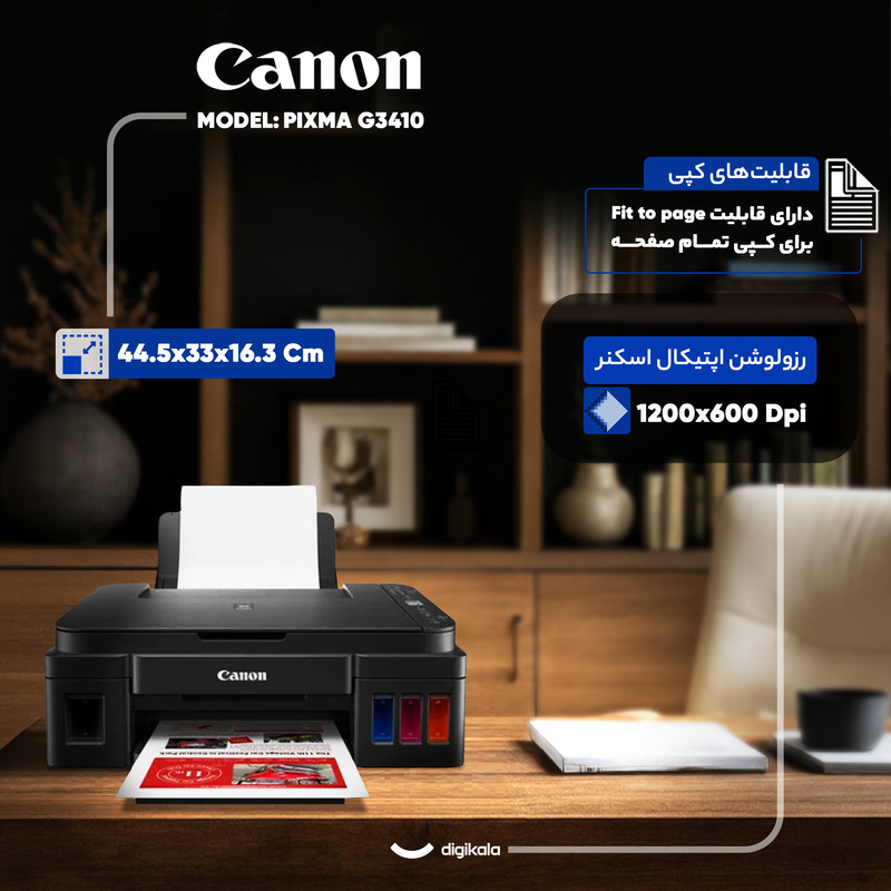 پرینتر«کانن» (Canon) مدل  «PIXMA G3410»باقابلیت چاپ رنگی برای مصارف خانگی و اداری گزینه‌ی مناسبی به شمار می‌رود. این دستگاه، علاوه بر پرینت، از قابلیت‌های اسکن و کپی نیز بهره می‌برد. اگر محل کار کوچکی دارید، این پرینتر با ابعاد جمع‌وجور، فضای کوچکی از میز کارتان را اشغال خواهد کرد و با وزن 6.3 کیلوگرمی به‌راحتی قابل جابه‌جایی است. با مجهز شدن به سیستم مخزن جوهر، پرینتر PIXMA G3410 هزینه‌ها را بسیار کاهش داده است. در این سیستم کافی است کاربر جوهر را در مخزن موردنظر و همرنگ بریزد و به امور چاپی بپردازد. پرینترهای پیکسما برای چاپ تصاویر گزینه‌ی بسیار ایدئالی هستند. این پرینتر به رزولوشن چاپ 1200 × 4800 dpi مجهز شده است و تصاویر رنگی و متون سیاه‌وسفید را با کیفیت بالایی به چاپ می‌رساند. از دلایلی که باعث شده تا پرینتر PIXMA G3410 برای چاپ تصاویر مناسب باشد، قابلیت چاپ بدون حاشیه است؛ با این ویژگی کاربر می‌تواند تصاویر موردنظر خود را در تمام صفحه و بدون هیچ حاشیه‌ی سفید اضافی چاپ کند. این پرینتر کانن می‌تواند در هر دقیقه 5 عکس رنگی و 8.8 عکس سیاه‌وسفید را چاپ کند. پرینتر PIXMA G3410 به اتصال USB 2.0 و وای‌فای مجهز شده است. به وسیله‌ی اتصال وای‌فای کاربران می‌توانند در کوتاه‌ترین زمان و بدون اتصال کابلی، به پرینتر متصل  شده و تصاویر و اسنادشان را به چاپ برسانند.